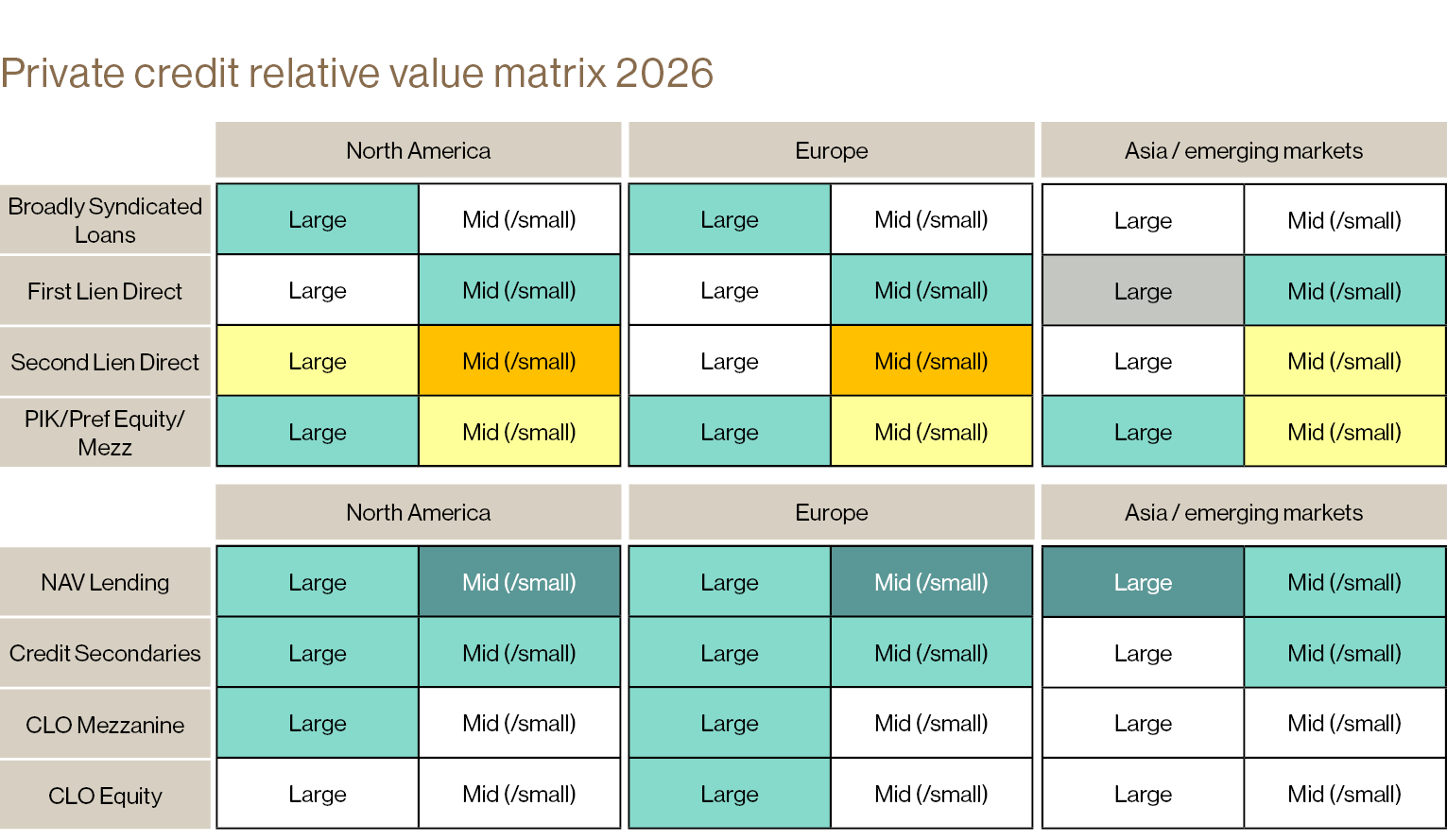 - Real estate strategy centers on vertical depth and regional selectivity. Secondaries offer compelling entry points, particularly as direct transaction activity remains subdued.