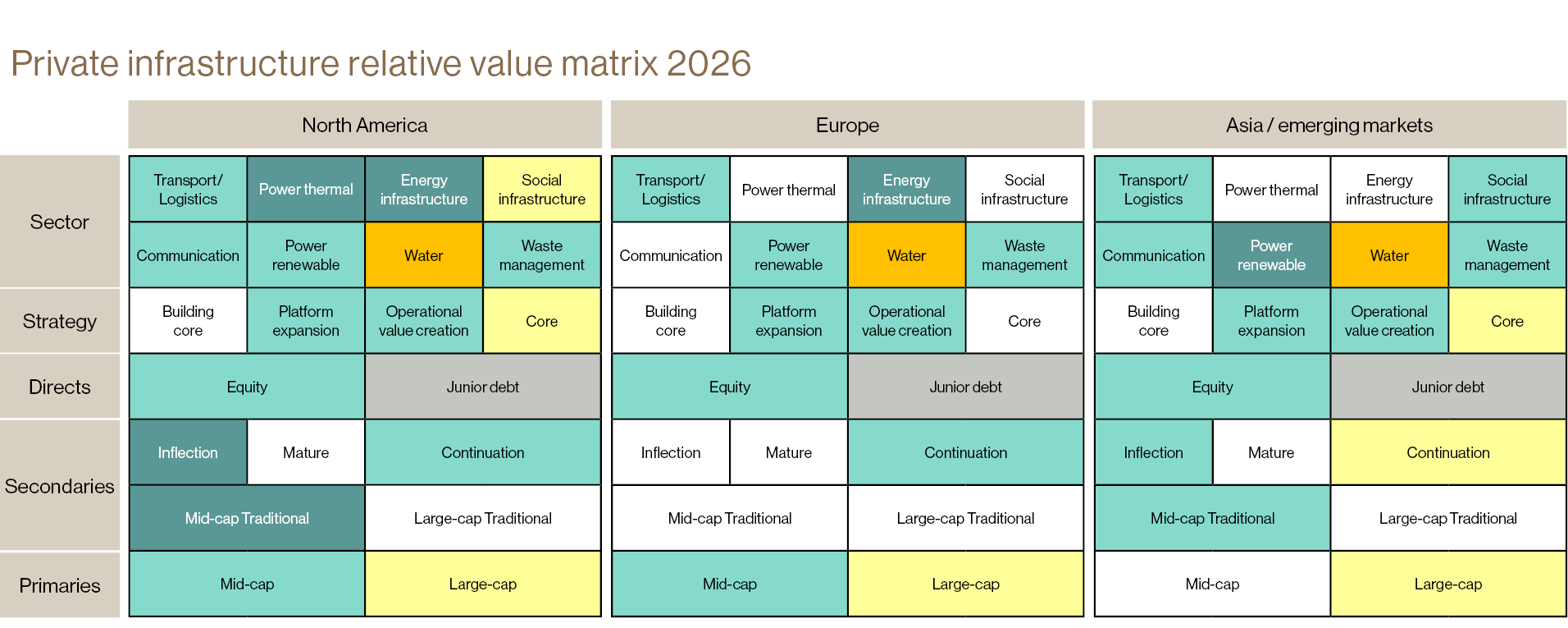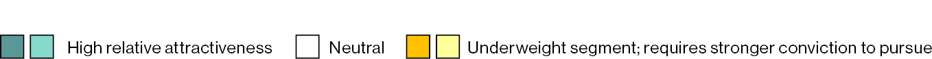 - Infrastructure is a strategic overweight for inflation protection and secular growth. We like mid-market secondaries and see compelling direct opportunities in areas such as US power and energy assets.