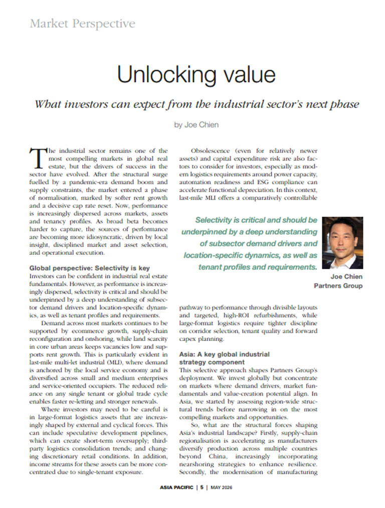 The industrial sector remains one of the most compelling markets in global real estate, writes Joe Chien, our Head of Real Estate Asia, in this article. Given performance is increasingly dispersed, selectivity in this sector is critical. Joe explains that our strategy invests globally but concentrates on markets where demand drivers, market fundamentals, and value-creation potential align. We think Asia offers attractive opportunities, which led to the establishment of our Singapore Industrial Platform in 2024.
