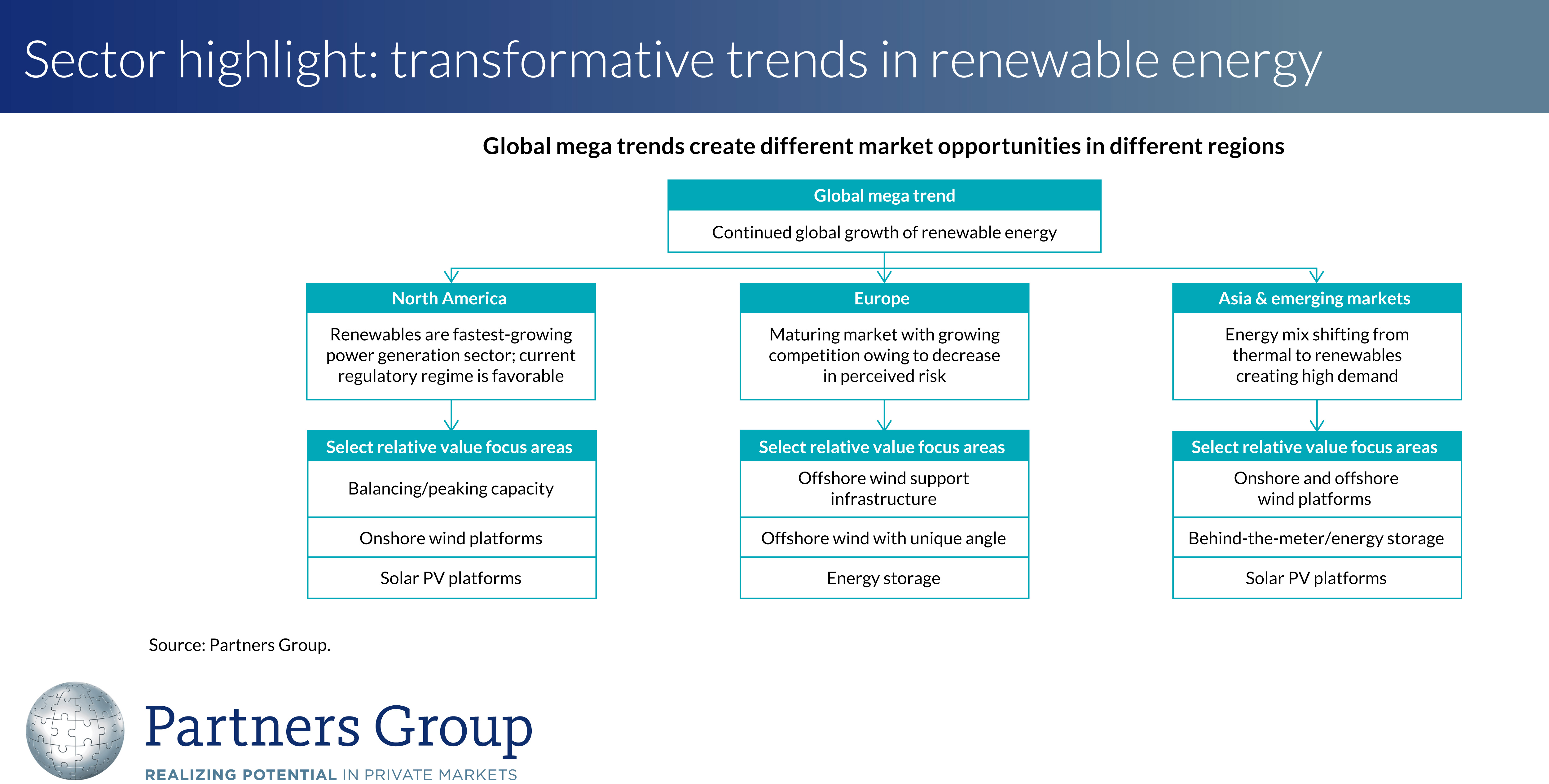 In our H2 2017 Private Markets Navigator, we talk about the increased reliance on renewable energy generation globally, which has created a number of attractive investment opportunities in different regions.