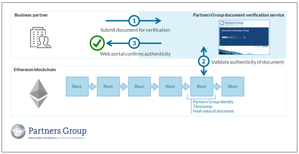 Against a backdrop of increasing cybercrime, Partners Group has placed increased focus on ensuring data and transaction security online. We recently launched a bespoke blockchain-based signing and verification service for our Treasury Management team to facilitate the exchange of important documents with third parties. The technology has the potential to be used across many operational processes requiring counterparty interaction, greatly enhancing security for Partners Group's clients and business partners. The graphic below shows how a counterparty can leverage this service for the validation of the integrity of a document.