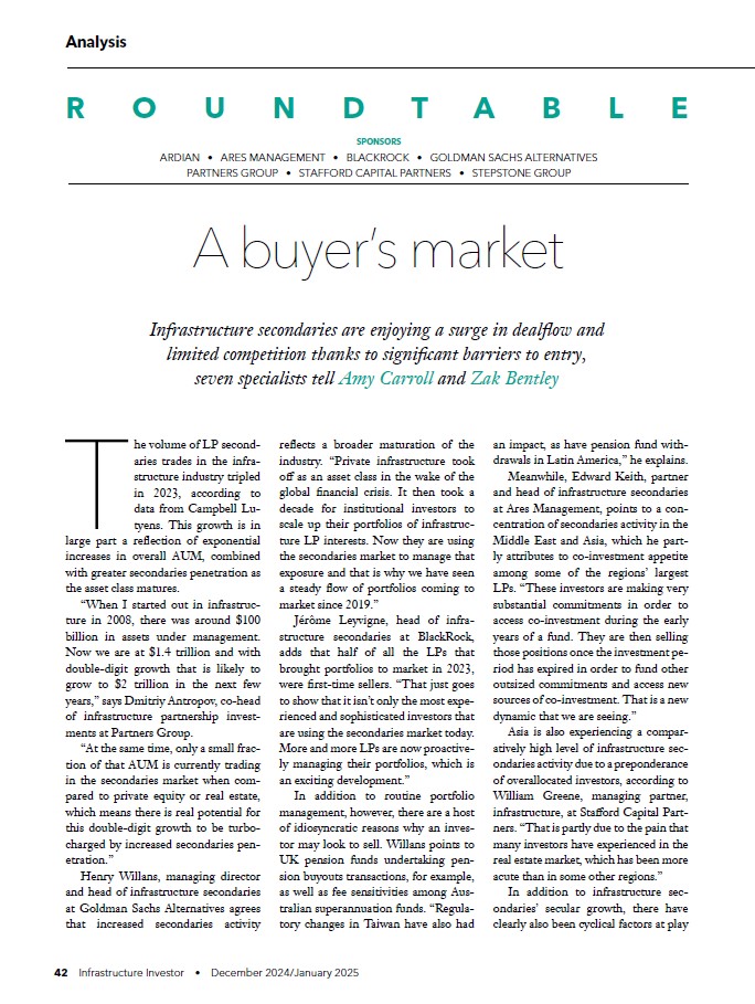 Our Co-Head of Infrastructure Partnerships, Dmitriy Antropov, joined an Infrastructure Investor roundtable to talk about the growth of infrastructure secondaries. Dmitriy told the panel that only a small fraction of infrastructure’s USD 1.4 trillion in AuM is currently trading in the secondaries market when compared to private equity, which means there is real potential for increased penetration. Dmitriy also said that the job of an infrastructure secondaries investor is likely to become more difficult given GPs are facing a harder time selling assets at a premium. However, an investor with a deep direct-like underwriting skill set and strong long-term relationships will be well-positioned.