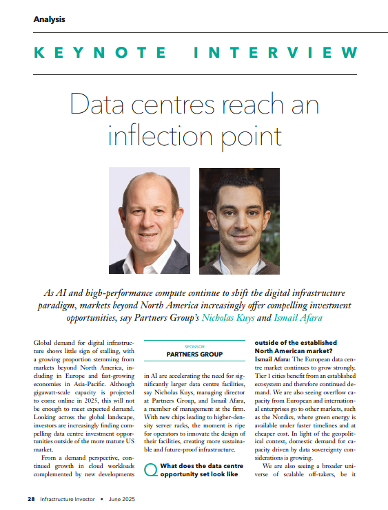 Nicholas Kuys and Ismail Afara from our Infrastructure team in APAC and Europe respectively spoke with Infrastructure Investor about the rapid growth of the data center market in these regions. In this wide-ranging interview, Nicholas and Ismail discuss the drivers for the rising data demand and how investment opportunities outside of the mature US data center market are becoming ever more attractive.