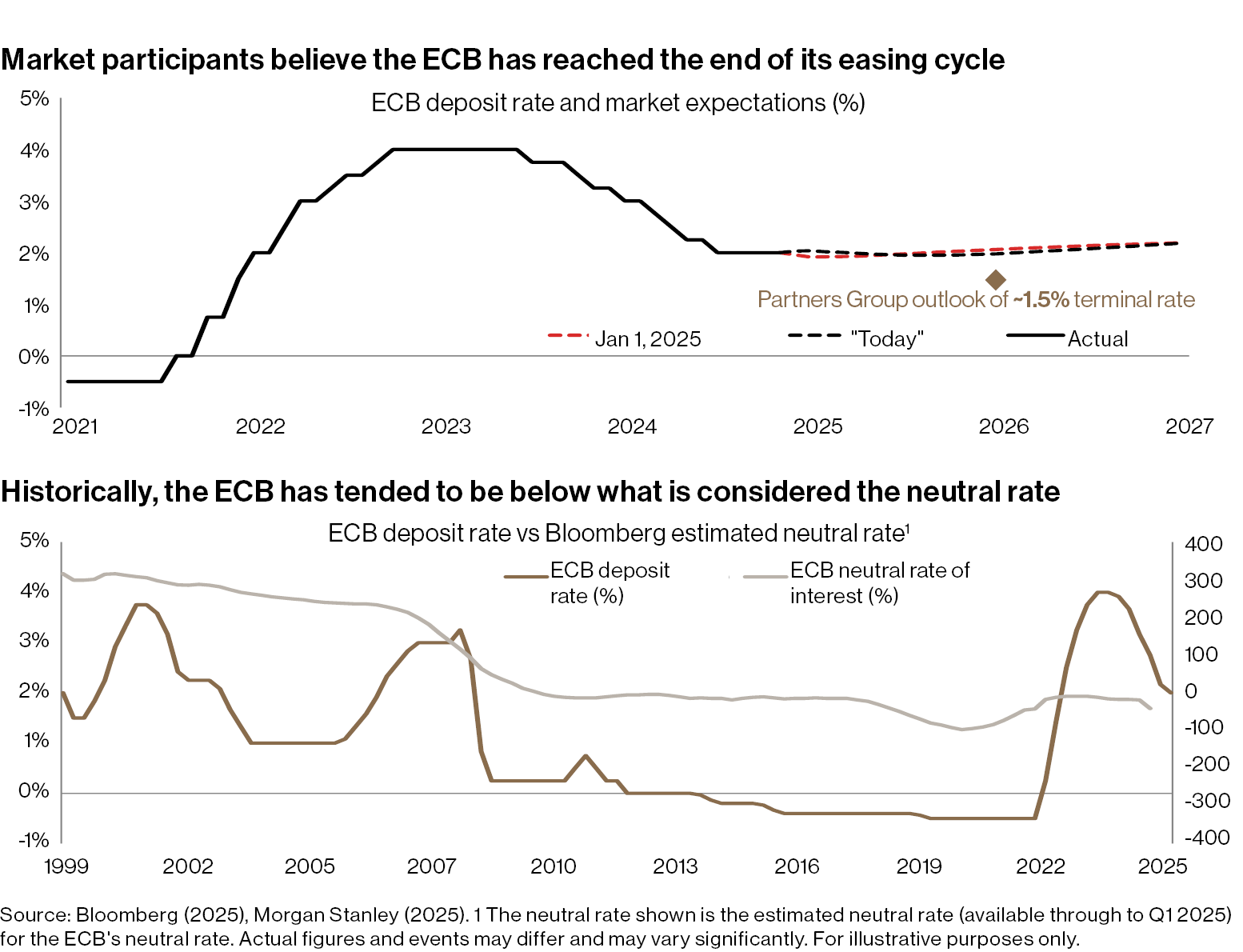 - Private credit returns are moderating as base rates decline, but Europe offers relative value. Selective middlemarket lending remains preferred.