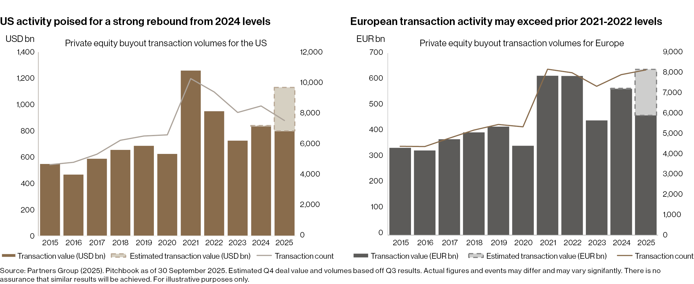 Both near-term dynamics and long-term structural forces shape our outlook for private markets. Our “Investing at High Altitude” macro view for 2026 anticipates increased activity in private equity and private credit. After several years of subdued investment and exit volumes, momentum has strengthened globally, with transaction activity rebounding sharply – a trend we expect to continue into 2026.