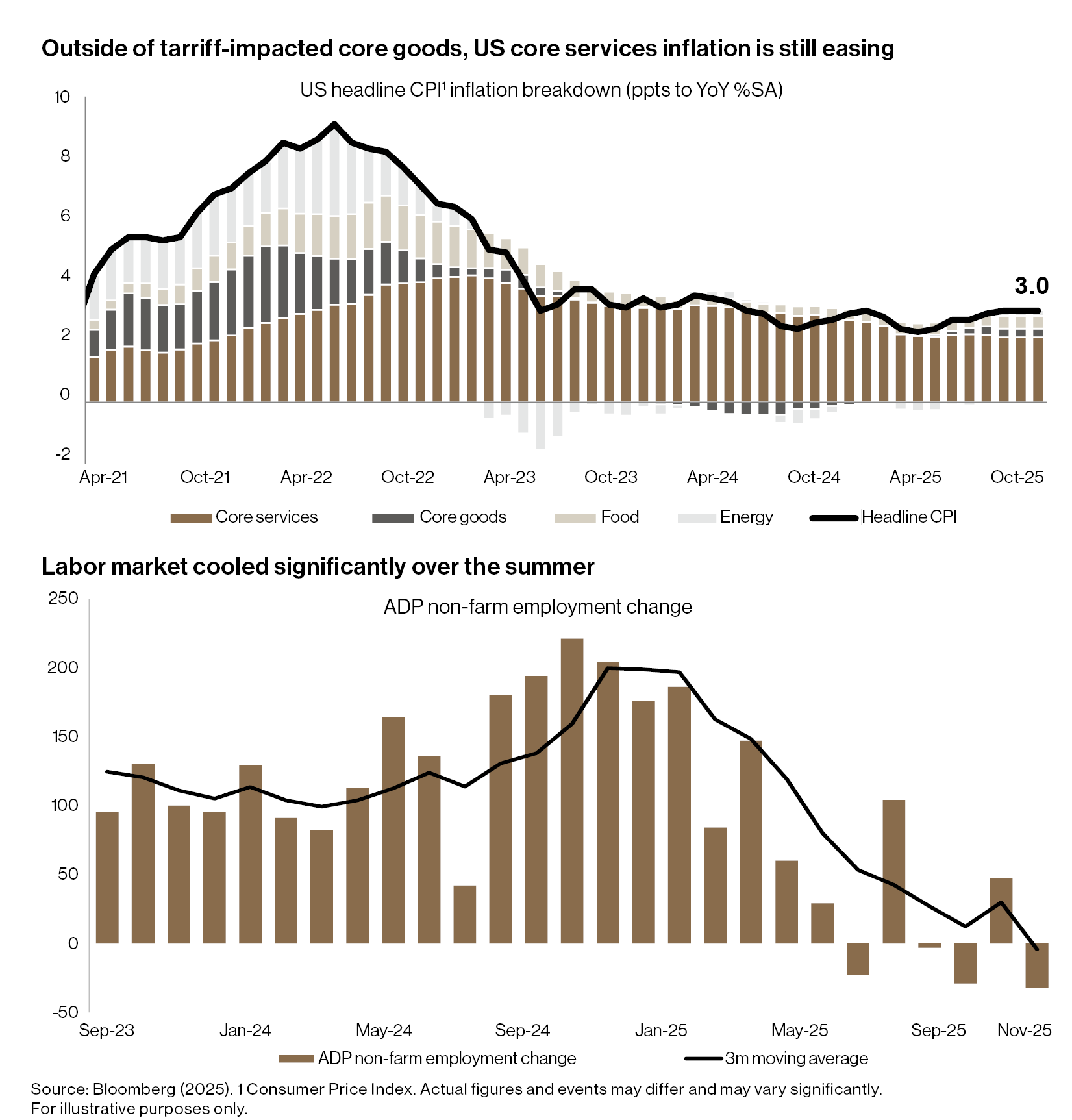 The US economy stands to benefit from recent Federal Reserve rate cuts, with additional easing likely in 2026 as labor market risks rise and inflation pressures diminish. Signs of strain are evident in layoffs across government, retail, and warehousing sectors, alongside a climbing unemployment rate and stalled job growth. Core services inflation is moderating, and tariff effects remain contained. With 75bps cuts delivered in 2025, we anticipate another 25-50bps in reductions in the year ahead.