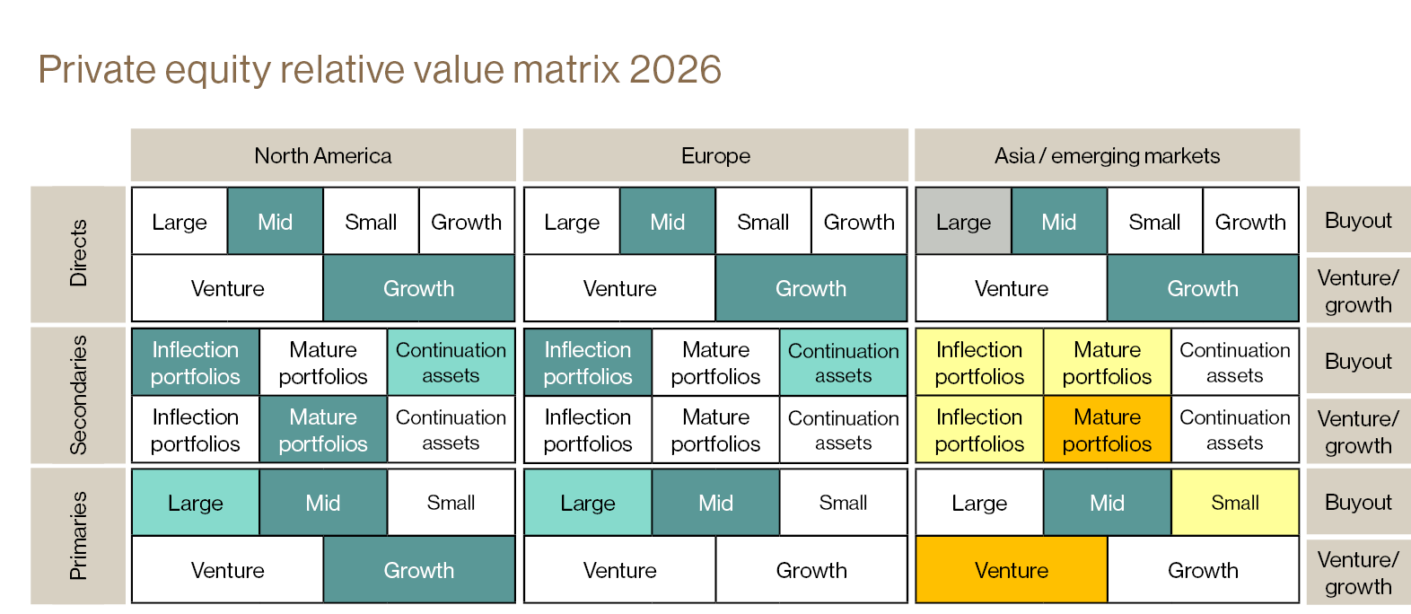 In secondaries, we overweight inflection LP-led transactions given current discounts, while maintaining exposure to mature secondaries as competitors wind down older funds. GP-led continuation vehicles are growing in volume, but quality is uneven; we apply heightened scrutiny. Regionally, both the US and Europe present compelling opportunities.