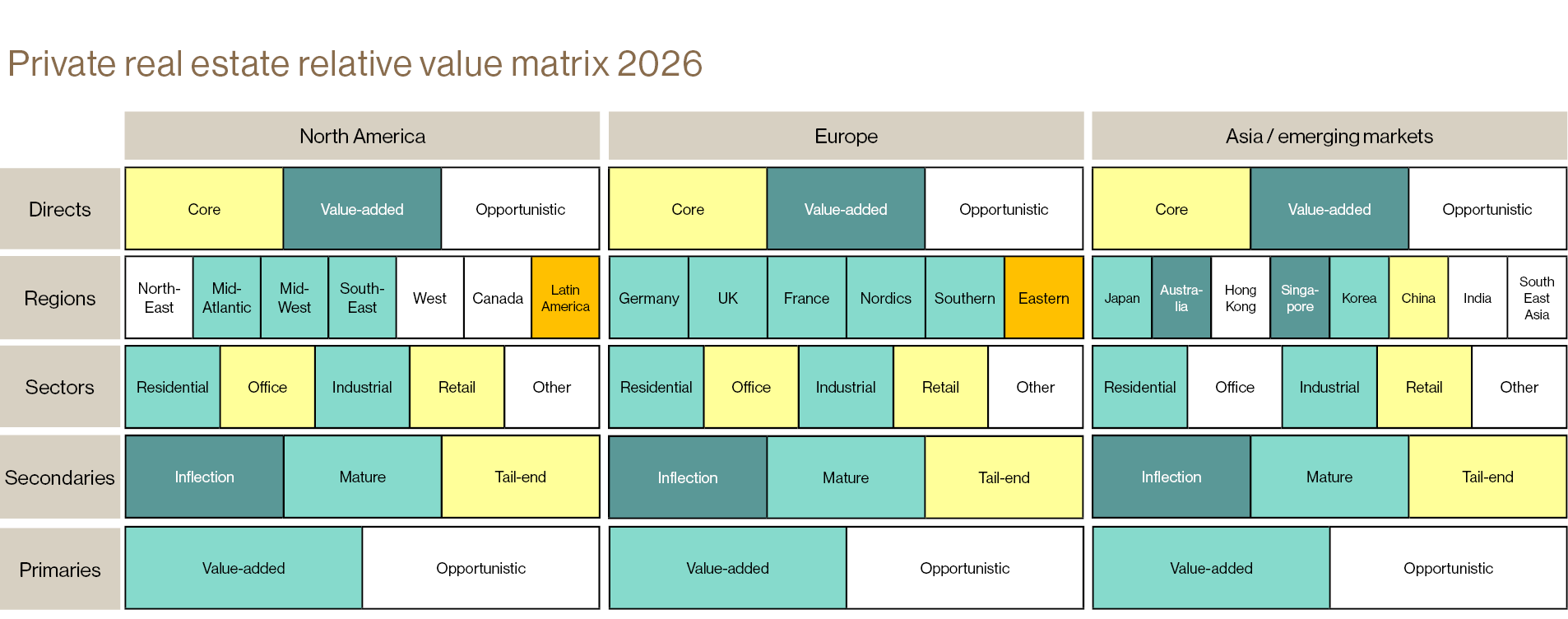 - Real estate strategy centers on vertical depth and regional selectivity. Secondaries offer compelling entry points, particularly as direct transaction activity remains subdued.