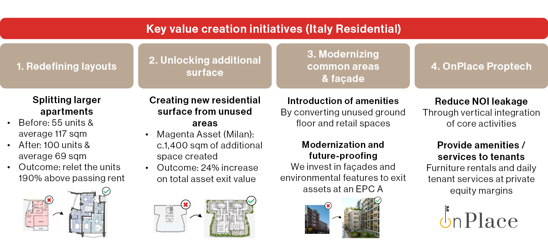 Since launch, tenant engagement has risen by 25% and vacancy periods have shortened from 38 to 29 days. Across c. 350 new rent agreements, rental rates achieved an average increase of 97.5%, with NOI up more than proportionally by c. 3.0x. This was the result of OnPlace's increased operational efficiency and high-margin ancillary services (e.g., furniture rentals, WiFi packages, etc).
