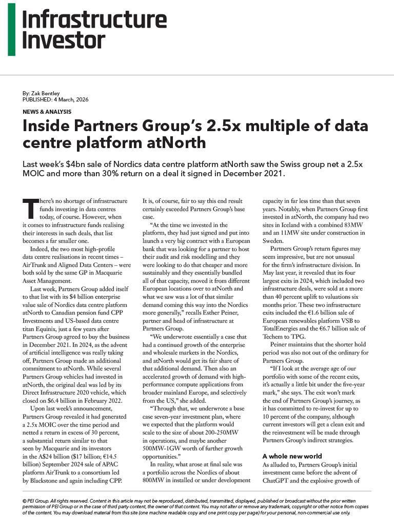 The USD 4bn sale of atNorth generated a 2.5x MOIC and more than 30% return on an investment it signed in December 2021. Speaking to Infrastructure Investor, Head of Infrastructure Esther Peiner discussed the evolution of the platform and how the firm approached the exit.