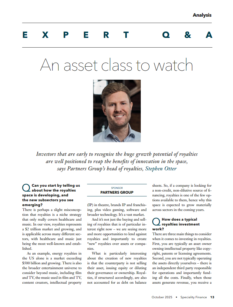 Royalties are quickly becoming a mainstream private markets asset class, Stephen Otter, our Head of Private Markets Royalties, recently told Private Debt Investor. The market currently represents a USD 2 trillion opportunity set with significant future growth potential and several emerging sub sectors. In this interview, Stephen explains what role royalties can play as a portfolio diversifier and stabiliser, how royalties can be accretive to credit-focused portfolios, how our innovative cross-sector strategy works, and the way broader market volatility has impacted demand for the asset class.