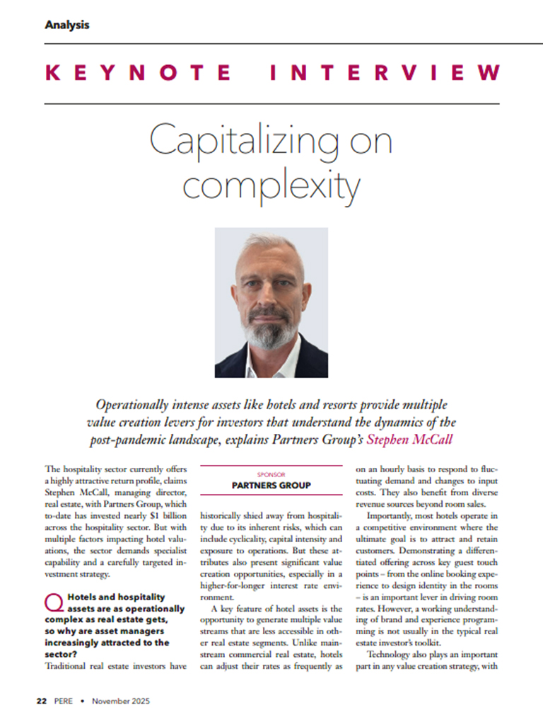 "Traditional real estate investors have historically shied away from hospitality due to its inherent risks, which can include cyclicality, capital intensity and exposure to operations. But these attributes also present significant value creation opportunities," Stephen McCall, a Managing Director in our Real Estate team, tells PERE in this keynote interview. Stephen also talks about the increasingly competitive hospitality market, the value creation levers that can be pulled, and where we see growth.