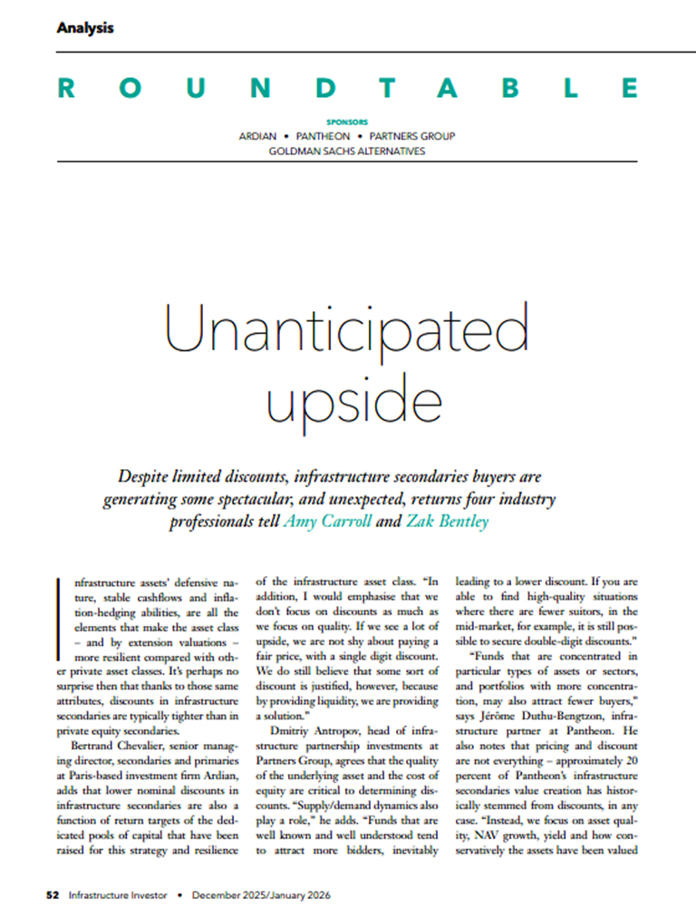 The head of our infrastructure secondaries strategy Dmitriy Antropov joined Infrastructure Investor's Secondaries Roundtable to reflect on another strong year for the infrastructure secondaries market. During the discussion, Dmitriy talked about how secondaries can be both thematic as well as opportunistic, how the quality of the underlying asset and the cost of equity are critical to determining discounts, and continuation vehicle opportunities.