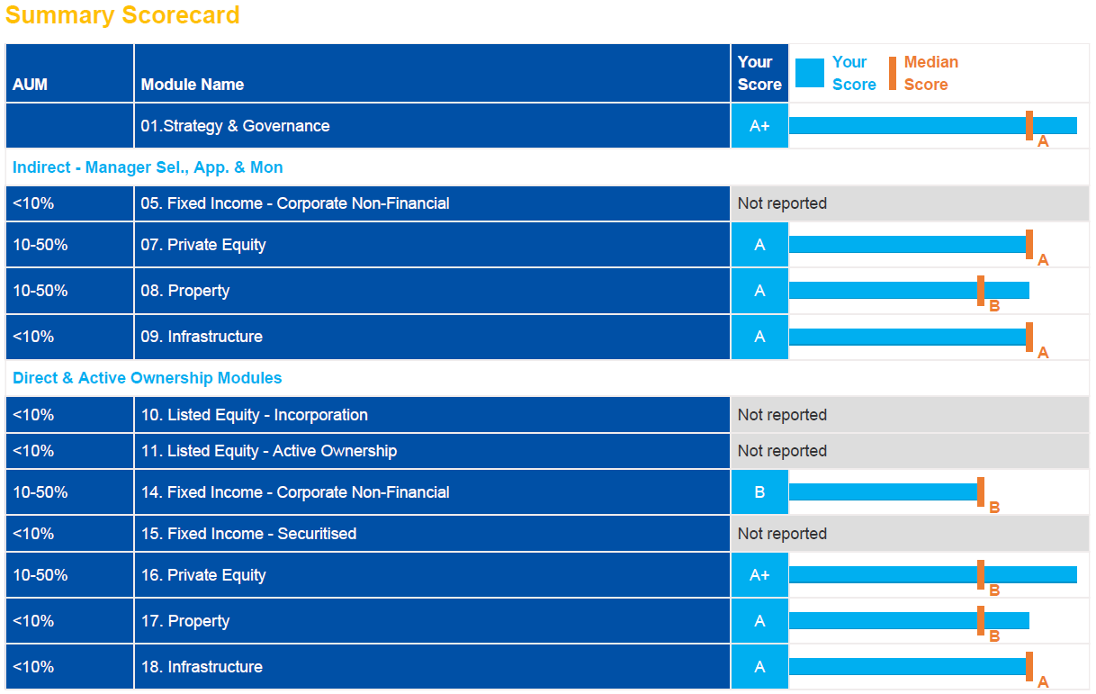 Partners Group upheld its A+ rating for 'responsible investment strategy and governance' for the fifth year running in the UN PRI's annual benchmarking assessment of its signatories. Strong results across asset classes were testament to a firm-wide commitment to ESG, including within direct private equity and infrastructure, which received A+ and A scores respectively.